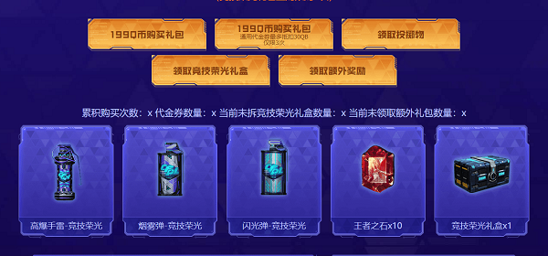 3.199QB购买“竞技荣光”礼包,即可以在通用代金劵的荣光入口抵扣下以169QB的优惠价格购买礼包 ,每次最多抵扣30个代金券,套装
